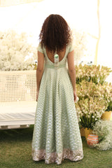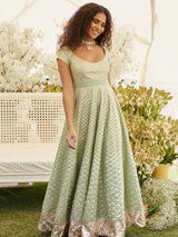 Green chanderi  anarkali embellished with gota and mirror embroidery paired with dupatta