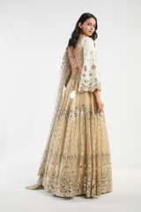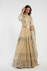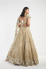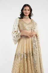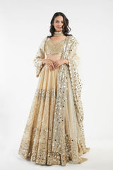 Fabric: skirt- tissue organza, blouse- raw silk, dupatta- net , embroidery- mirror and zari