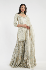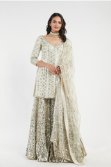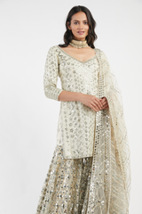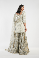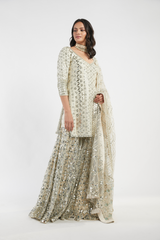 Fabric: Sharara- net and raw silk , raw silk- kurta , dupatta-net, embroidery mirror and zari