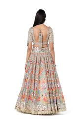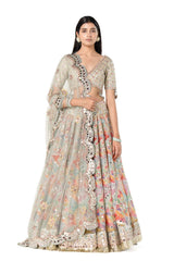 Colour : Skirt : Multicolour print / Blouse : Multicolour resham work with gota base / Dupatta : Powder blue