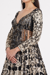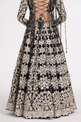 Jet black lehenga set embellished using ivory details