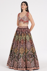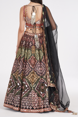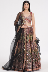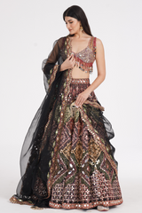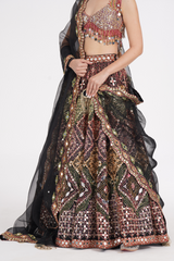 Matte black lehenga embellished using warm pastels