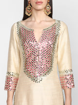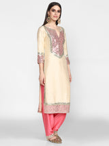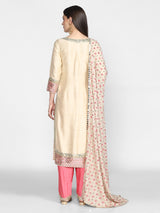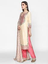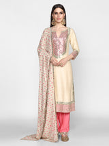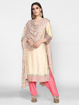 Beige & Pink Kurta Set with Chiffon Dupatta