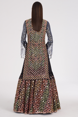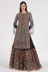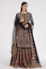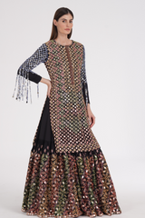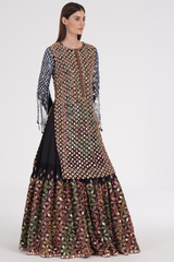 Matte black kurta skirt set embroidered using warm Pastels