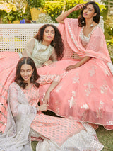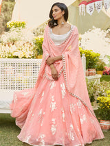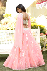 Pink organza lehenga paired with embellished raw silk blouse and paired with dupatta