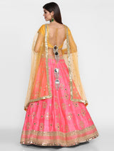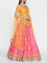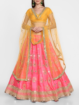 Neon Pink and yellow embellished lehenga set embroidered with mirror and zari work; paired with a mustard net dupatta