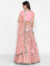 Neon pink embellished lehenga set adorned with mirror and zari work; paired with a tonal net dupatta