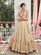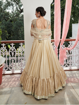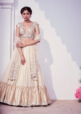 Beige woven chanderi lehenga set embellished with mirror and gota work paired with blouse with dupatta