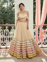 Ivory crop top and ombre skirt set embellished with mirror work and zari embroidery