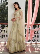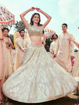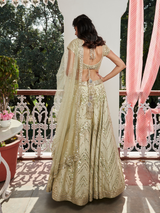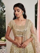 Ivory embellished raw silk lehenga set adorned with mirror and gota work paired with dupatta