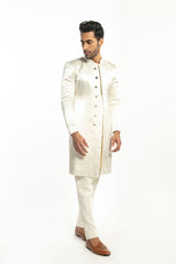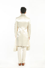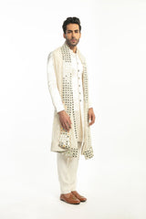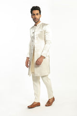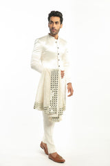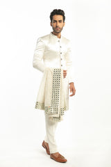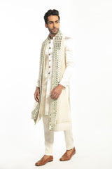 Fabric Description: Sherwani - Satin glace , Kurta- Chandheri , Stole- Woven Chandheri , Pants - Raw Silk