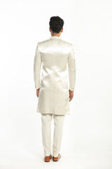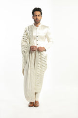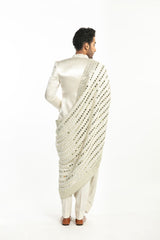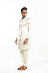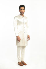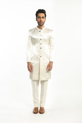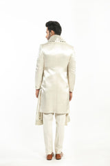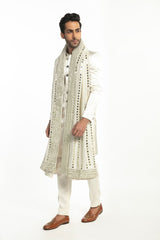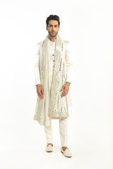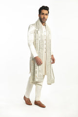 Fabric Description: Sherwani- Satin Glace , Kurta- Chanderi, Stole- Linen, Pants- Raw Silk
