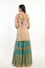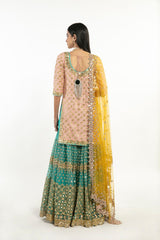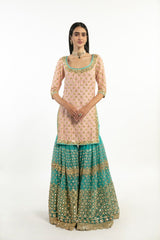 YELLOW, PEACH AND TURQUISE EMBELLISHED SHARARA SET