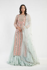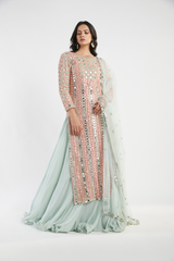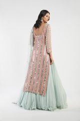 Fabric: skirt- flat chiffon, kurta- net , embroidery mirror and resham