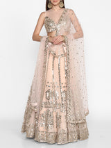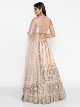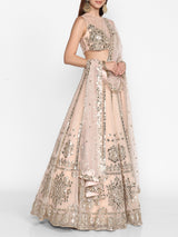 Dusky Pink embellished lehenga set adorned with mirror and leather work; paired with a tonal net dupatta