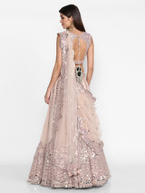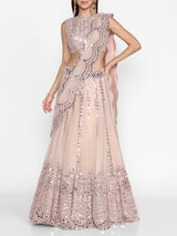 Lilac embellished lehenga set adorned with mirror and zari work; paired with a tonal net dupatta