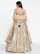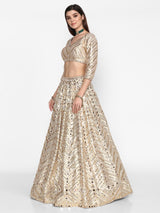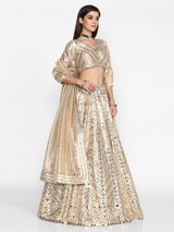 Chandheri lehenga set adorned with golden gota, mirror and zari embroidery paired with golden tissue organza dupatta