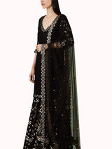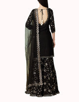 Black sharara set paired with a dupatta; highlighted with resham, zari and our signature mirror work