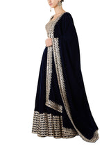 Blue velvet lehenga set paired with a dupatta; adorned with sequins, zari, gota and mirror work