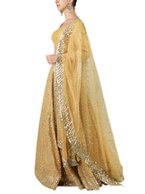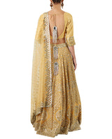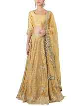 Yellow lehenga set paired with a dupatta; adorned with sequins, zari, resham and mirror work