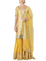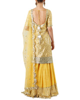 Yellow sharara set paired with a dupatta; adorned with sequins, zari and mirror work