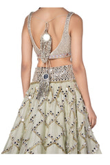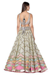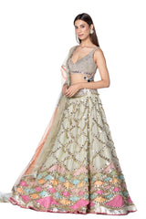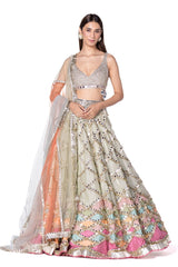 Colour : Skirt : Leaf green base with multicolour / Blouse : Silver / Dupatta : 4 multicolour shade