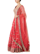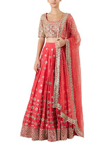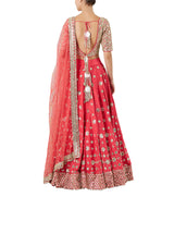 Hot pink lehenga set paired with a dupatta; adorned with sequins, zari, and mirror work