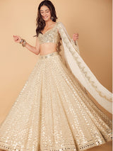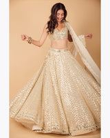 Ivory mirror work organza lehenga with raw silk blouse and chiffon dupatta